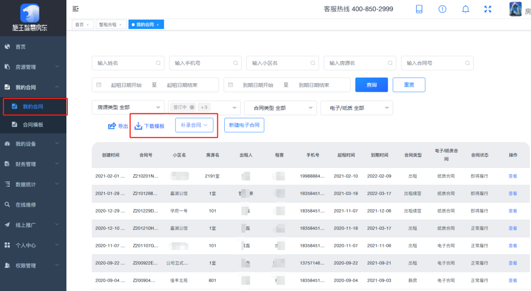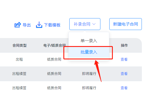批量录入合同:我的合同-①下载模板-②将原平台导出的相关租约信息填入对应表格--③批量录入合同